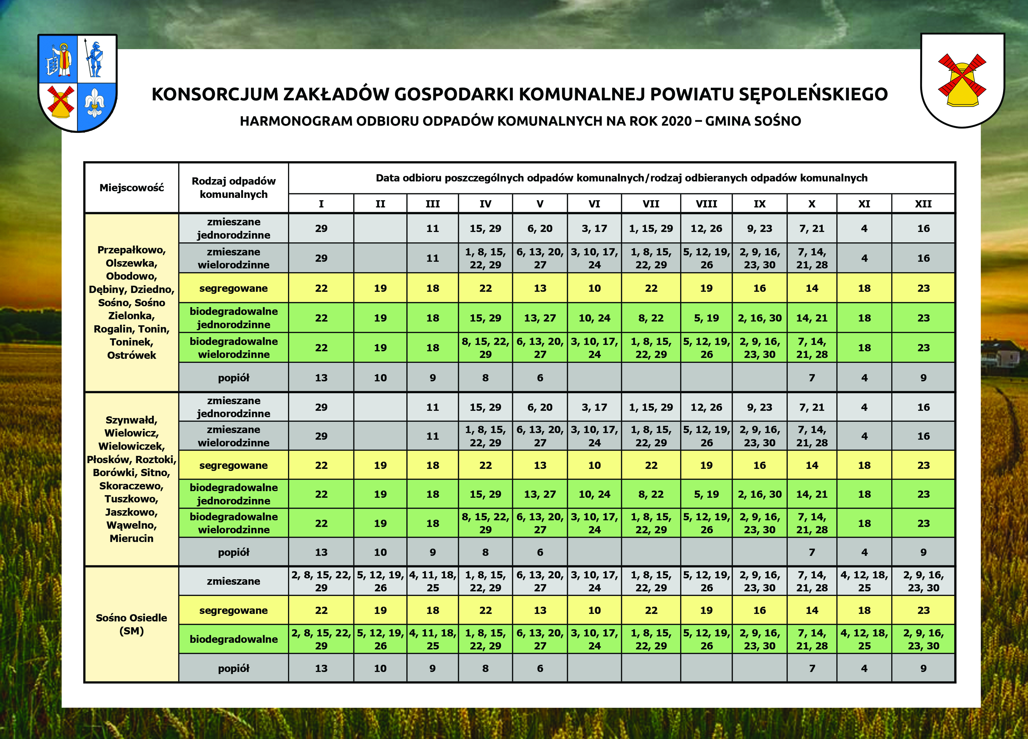 | utworzono: | data: 11:09, 02.01.2020 | przez: Barbara Bielewicz | Harmonogram odbioru odpadów komunalnych na rok 2020 - gmina Sośno |